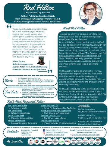 Red uses her experience as a former comedienne, a marathoner, a mom, and a tired old grumpy lady to compulsively work towards getting herself and others from point A to point B as quickly and easily as possible. Inspired by a 30-year career, a very long run through Boston, and an overwhelming need to simplify her life, Red founded BelmontCityPress.com. Her first book solidified her as a go-to person in her industry, and with her follow-up series, Red literally "wrote the book" on marketing to succeed in business. In her latest literary labor of love, “The Power of Not Yet: Unleashing Your Potential One Rejection at a Time, “ Red has decidedly given her readers permission to establish credibility, brand their expertise, simplify their lives, & gain more business. She has set her sights on sharing her journey, experience and expertise with you.